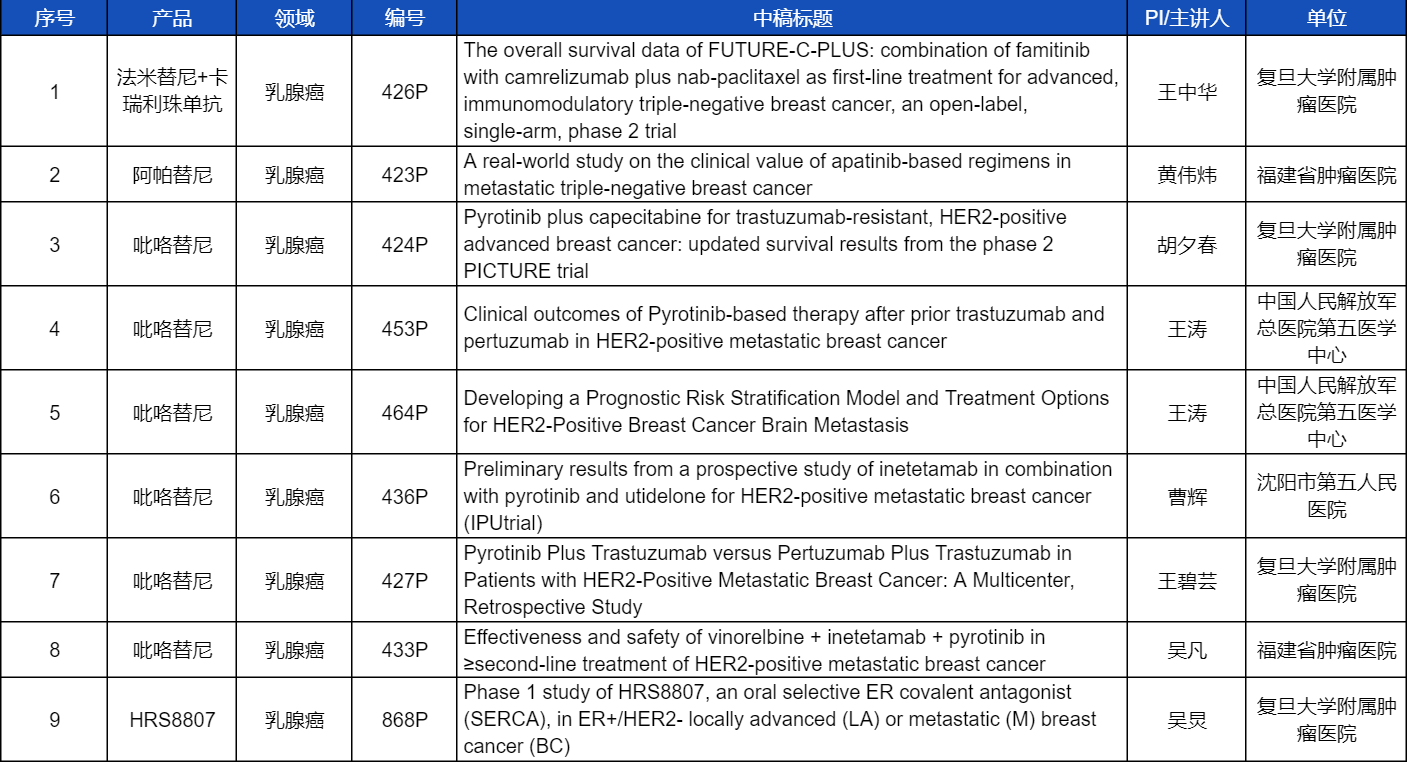 在乳腺癌领域,吡咯替尼、阿帕替尼、卡瑞利珠单抗、法米替尼,或产品间联合或联合化疗,共有9项研究入选壁报讨论,其中吡咯替尼占据6项,较为全面地展示了这款中国首个自主研发抗HER2靶向药在乳腺癌治疗中的显著特点和潜力。此外,918博天堂医药自主研发的新型选择性雌激素受体共价拮抗剂(SERCA)HRS8807治疗ER+/HER2-局部晚期或转移性乳腺癌的Ⅰ期研究也成功入选,有望为此类患者带来更多用药新选择。
